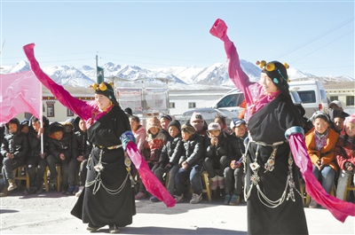 囊谦县老年文艺宣讲队走进基层宣讲党的十九大精神。李兴发 摄 冬日的寒风把位于肖容多盖拉山下的玉树藏族自治州囊谦县着晓乡巴尕村吹了个透心凉。12月7日,囊谦县老年文艺宣讲队的到来,却让生活在海拔4300多米的牧民们喜出望外。 “目前我们的任务主要是党的十九大精神宣讲。为了将党的声音传遍囊谦县这片藏韵古地,我们已经开展了13次专场的宣讲,巴尕村是第14场。”囊谦县老年文艺宣讲队队长、退休干部苏才告诉记者。 巴尕村219户牧民绝大多数都分散在自家的冬季草场,两天前得知老年文艺宣讲队要来村上宣讲演出的他们,眼下能赶来的都穿着厚厚的皮袄坐在村委会的广场上。正午时分,“中国是个大家庭,兄弟姐妹五十六。”老年文艺宣讲队用藏语自编自唱的社会主义核心价值观“七字歌”,随着高原的寒风悠扬地飘向远方,囊谦县特有的藏族传统舞蹈卓根玛,更让在场的所有人忘记了雪域的寒冷,“噢唔噢!”欢呼声不断,“雅布、雅布(好)”掌声此起彼伏。 “用符合群众‘口味’的形式,把党的政策唱进牧民脑子里,舞到农牧民的心坎上,一直是我们老年文艺宣讲队宣讲的宗旨。”今年66岁的副队长阿保趁着演出的间隙介绍到。 “求珠得勒(下午好)……”歌停舞息后,阿保接过麦克风切入主题,他用洪亮的声音开始用藏语向牧民宣讲十九大精神,内容主要集中在了过去五年国家取得的成就,提高保障和改善民生水平,特别是十九大报告中提出的,深化民族团结进步教育,铸牢中华民族共同体意识,加强各民族交往交流交融,促进各民族像石榴籽一样紧紧抱在一起等内容。为了不让牧民听着枯燥,在每一段内容结束后阿保还特意安排了歌曲演唱,而歌曲内容也紧贴着十九大的精神。 “这样的宣讲我们愿意看,也愿意听!”牧民才德说,轻轻松松就了解了国家的政策,比拿着材料一阵读要记得牢。 4年来老年文艺宣讲队走到哪里都深受当地群众的欢迎。文艺宣讲的形式不仅渐渐唤醒了牧民们心底埋藏已久的文化情结,也将党的政策随着歌舞在草原上传播开来,没有辜负老年文艺宣讲队创建的初衷。 在藏族的传统文化里,老人是知识和智慧的拥有者,是年轻人的教育和教导者。2012年初,为打破囊谦县宣传队伍少,宣传形式单一以及内容死板的困境,囊谦县委宣传部经过2个月的走访物色,从当地10个乡(镇)中挑选出了20名民间艺人和非物质文化遗产传承人,组成了这支平均年龄50岁以上的老年文艺宣讲队。 “培训后,从2013年开始,我们就正式参与全州全县各类宣传活动。” 队长苏才粗略地算了一下,老年文艺宣讲队宣讲行程已经达到上万公里,以巡回演出的方式宣讲了包括环保、教育、扶贫以及中央一号文件、省十三次党代会精神在内的十多项内容,观众达到5万多人,几乎占了囊谦12万人口的一半,并且其影响力已经从县逐步向玉树全州蔓延,成为了当地政策宣讲的一支主力军。 2015年中央宣传部办公厅为这支老年文艺宣讲队颁发了“基层理论宣讲先进集体”奖状,队长苏才自豪地说:“我们的工作连中央都表扬了!”苏才告诉记者,他会带着队员们加强中央和省州出台的各项政策的学习领会,排出更多接地气的宣讲节目,把政策像阳光一样播撒到牧区每个角落。(李兴发)