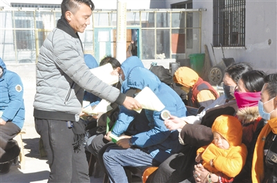 向牧民发放藏文版的十九大精神宣讲材料。李兴发 摄