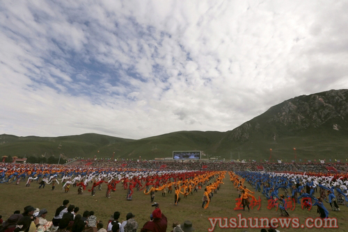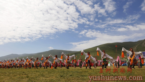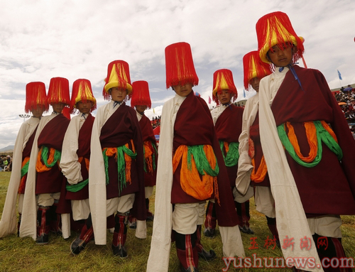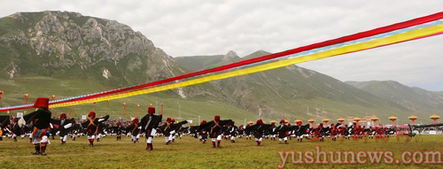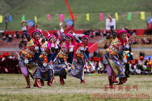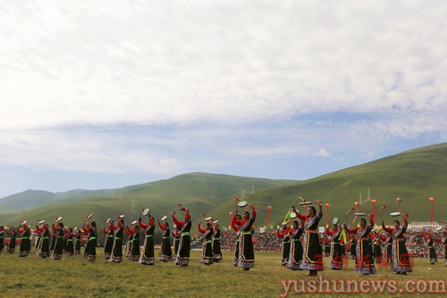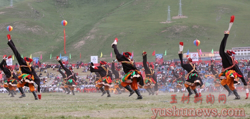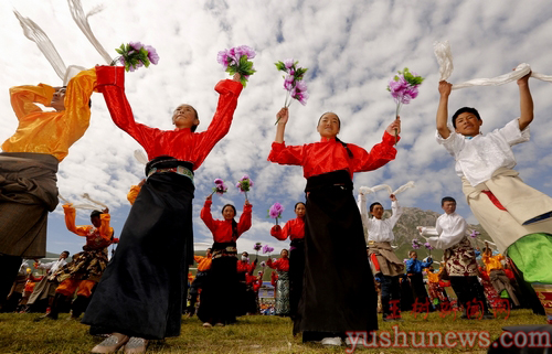 玉树新闻网讯 玉树歌舞主要由“伊”、“卓”、“热巴”、“热伊”、“锅哇”等组成。 “锅哇”,意为武装者或武士舞,是玉树特有的风格独特的礼仪性民间舞蹈,在寺院庙会或部落的重大礼仪性场合表演。表演者均为男性俗民,头戴垂有红丝穗的圆形高筒帽,藏语称“觉拉”,身着节庆盛装,佩戴“嘎吾”(银质镀金护身佛龛)、项链、腰饰等饰物,表演队形以转圈为主,旌旗导前,长号开道,一人击钹领舞,其后有一至二名持剑拿盾的舞者,其余皆持剑握弓。随着领舞者的击钹、击节而舞,中间穿插着说“锅斜”(道白)、唱“锅勒”(锅歌)。其特点是舞姿徐缓庄重、气氛肃穆、场面宏大、风格古朴凝重,被誉为“藏族仪仗”。 “热伊”是一种精美绝伦的舞蹈品种,兼具“热巴”和“伊”的风格特色,具有优美动听的音乐旋律、丰富多彩的舞蹈语汇、生动奇特的表演形式、幽默诙谐而富有情趣的舞蹈动作。“热伊”中的《索莱姆索》、《孜琼尕松卓玛》以及素有藏族交际舞之称的《琼珠索那措》等舞蹈更是美仑美奂,具有很高的艺术价值和欣赏价值,是精美绝伦的歌舞艺术珍品。 “卓”是一种表演性很强的民间舞。“卓”与“伊”一样,都是众人参与的集体群舞,圆圈式舞蹈队形,节奏先慢后快,但是风格迥异。“卓”的曲调低沉舒缓、庄重饱满,动律沉稳有力,动作大、节奏慢,如双臂的舒展、腿脚的起落,都在悠然缓慢地进行,落脚无声雄健有力,大有柔中寓刚的恢宏气魄,所以“卓”的舞姿显得异常刚健豪放。大气磅礴,从另一个侧面展示了玉树土风舞的阳刚美和庄重美。(作者:白福兰)
